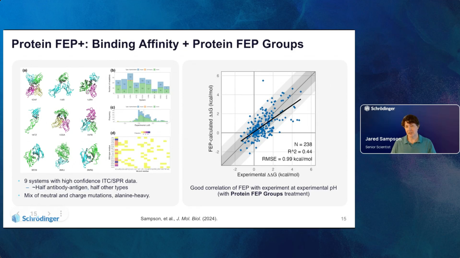 Jared Sampson joined Schrödinger in 2020, working primarily on analysis of and development of improved workflows for Protein FEP+ calculations. He received a Ph.D. from Columbia University, training in computational molecular biophysics and experimental structural biology and biophysics under Rich Friesner and Larry Shapiro, respectively. With 17 years of experience in the field, his prior work and research interests include host-pathogen, antibody-antigen, and antibody-receptor interactions; protein engineering; and pH-dependent binding.