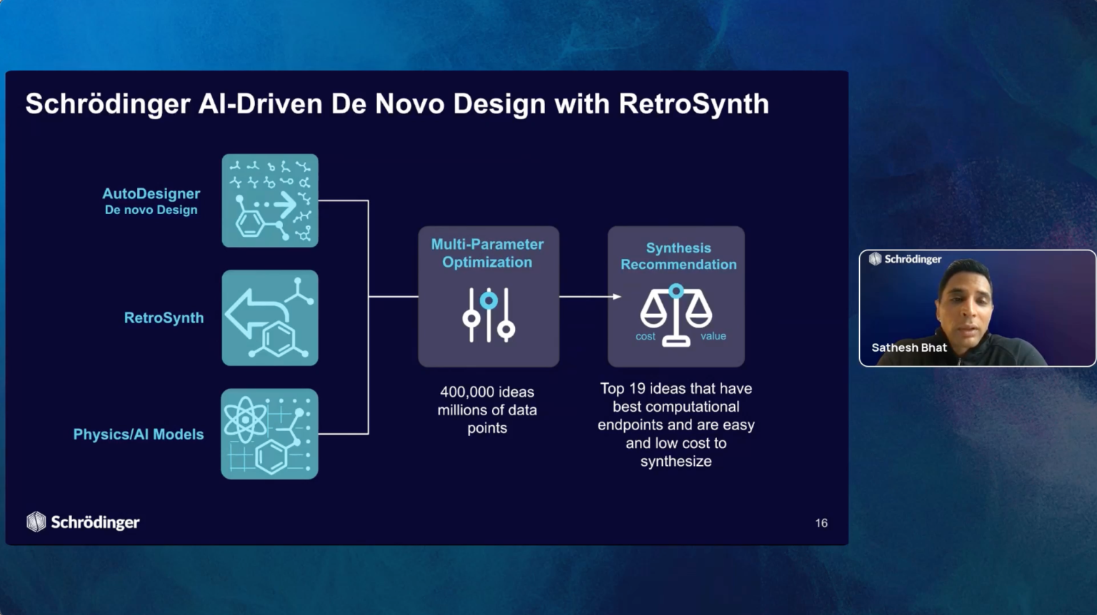 Join us for the introduction of RetroSynth, Schrödinger’s AI-driven synthesis planning platform. RetroSynth is engineered to accelerate and scale conventional retrosynthesis by harnessing advanced deep learning algorithms. RetroSynth uses a distributed cloud-native Monte Carlo tree search (MCTS) architecture to perform highly exhaustive searches to predict and score optimal, accurate, and cost-efficient synthetic pathways. RetroSynth helps you move from complex chemical targets to actionable synthesis plans accurately and efficiently. By integrating real-time building block data with AI and physics-based modeling, RetroSynth unlocks accurate retrosynthetic analysis across millions of de novo designed molecules, leading to massive project acceleration and cost savings in hit identification and lead optimization.
